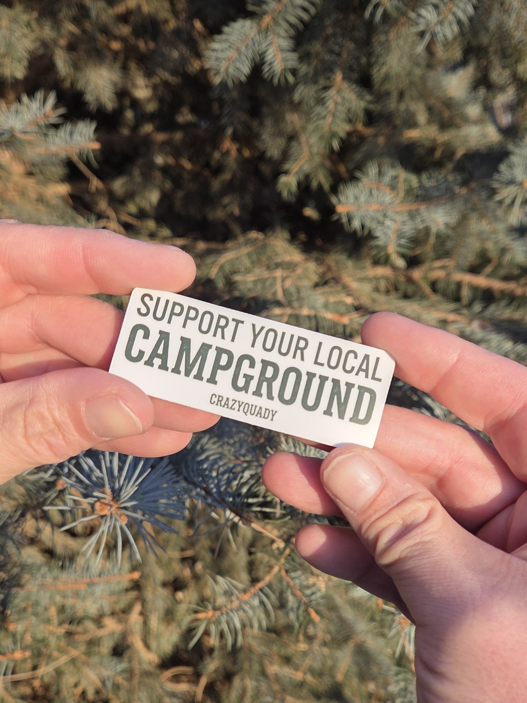 Show off your love for the great outdoors and represent the CrazyQuady community with our official "Support Your Local Campground" sticker! These durable, high-quality stickers are designed to handle the elements, whether you're slapping one on your truck camper, your favorite cooler, or your water bottle. It's more than just a piece of vinyl; it's a way to spread a positive message and help keep our favorite camping spots thriving! Grab one for you and one for your homie today! Thick, durable vinyl protects the sticker from scratching, rain and sunlight. Measures 3" x 1.17"