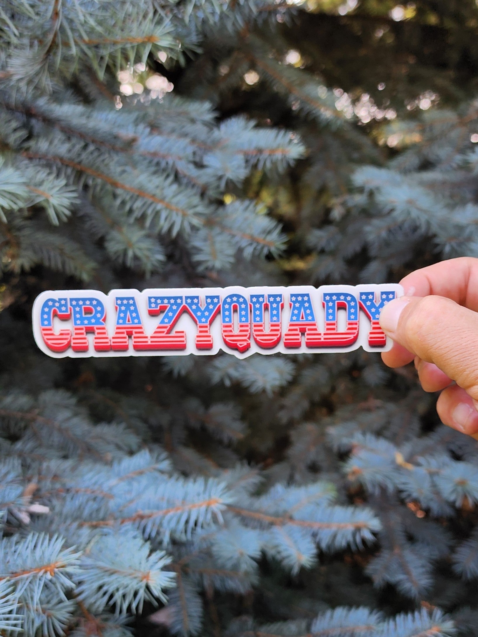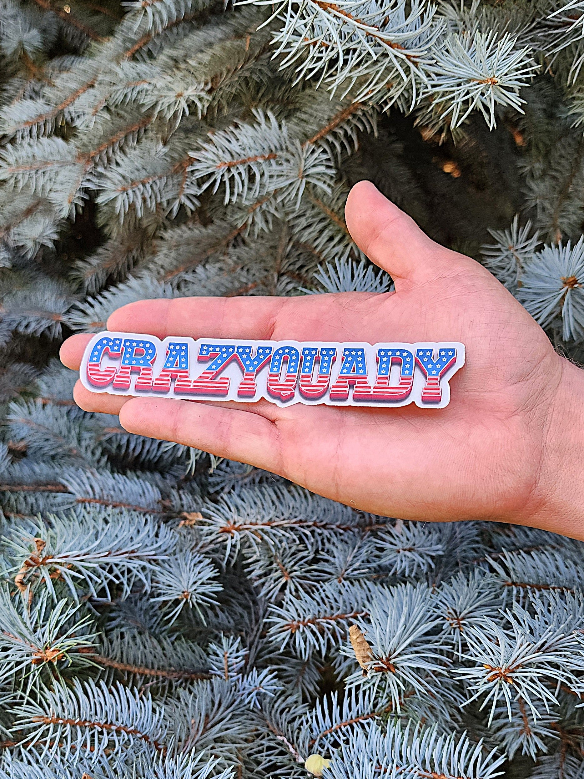 Grab the limited run stars and stripes CrazyQuady sticker! Only 100 available - never to be made again! Celebrate the 4th of July and summer by sporting your CrazyQuady sticker on your dang ol' dang things! Thick, durable vinyl protects the sticker from scratching, rain and sunlight. Measures 6" x 2"